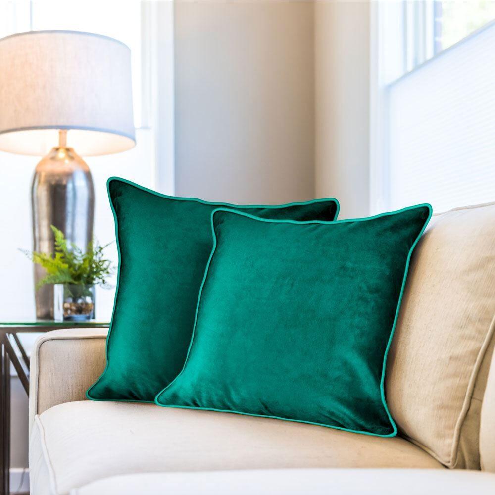 Complementary piping adds subtle texture to these decorative velvet cushions.
