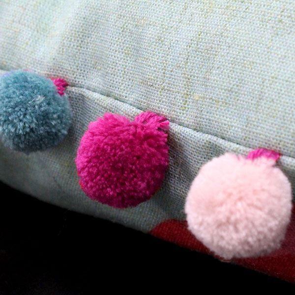 Complete with multicoloured pompom edges in baby pink, blue and hot pink simply adds to the cushion�s whimsical nature.